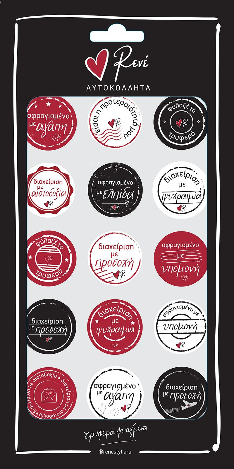 Σετ διάφανα αυτοκόλλητα Rene με τρυφερά μηνύματα όπως «Σφραγισμένο με αγάπη», «Διαχείριση με αισιοδοξία» και πολλά άλλα. Ιδανικά για να δώσουν ξεχωριστή πινελιά σε δώρα, σημειώσεις και προσωπικά αντικείμενα.