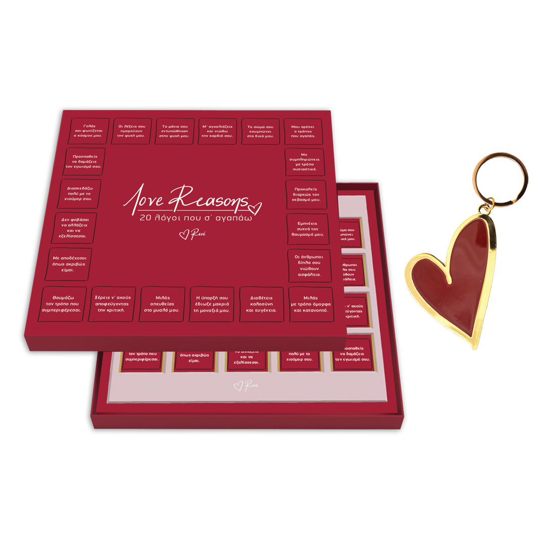 Είκοσι λόγοι που σ' αγαπάω. Είκοσι σοκολατάκια, είκοσι μηνύματα. Η αγάπη δεν χρειάζεται λόγους, αλλά μερικές φορές είναι ωραίο να τους θυμάσαι. Ένα δώρο που είναι μια ολόκληρη εξομολόγηση, μαζί με ένα μπρελόκ καρδιά.