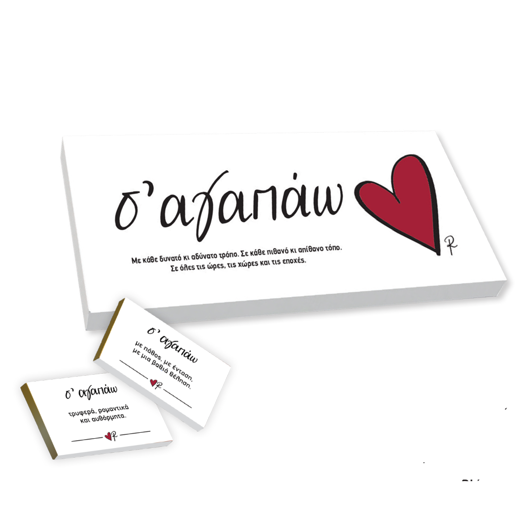 «Σ’ αγαπώ». Μερικές σημαντικές λέξεις, κλεισμένες μέσα σε ένα σοκολατένιο δώρο. Έξι διαφορετικά μηνύματα αγάπης. Γιατί η αλήθεια δεν χρειάζεται πολλά λόγια, μόνο μια γλυκιά εξομολόγηση.